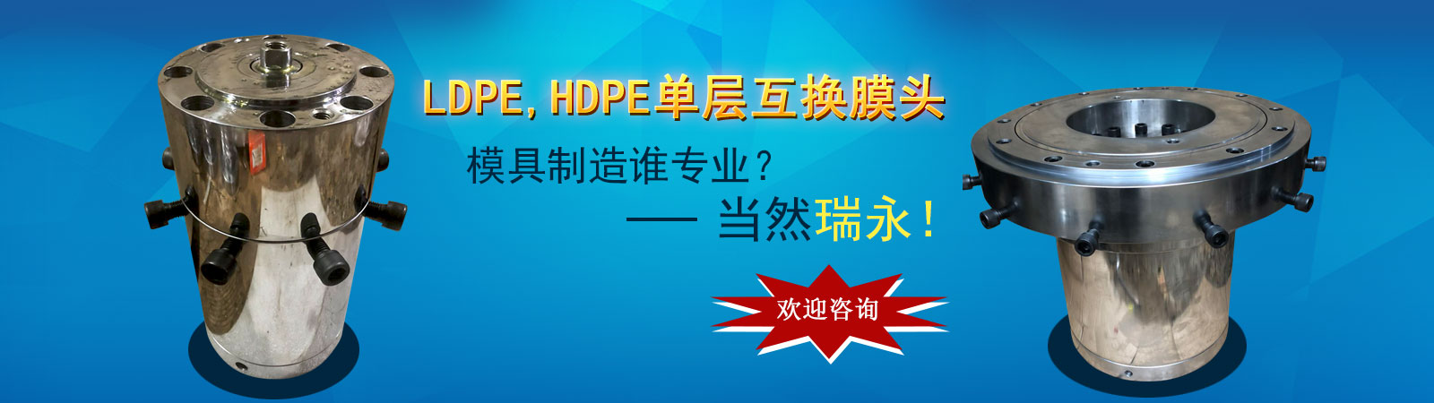 瑞安市瑞永模具有限公司是一家科研、制造、銷(xiāo)售、服務(wù)為一體的綜合性企業(yè)。專(zhuān)業(yè)生產(chǎn)各種規(guī)格的吹膜機(jī)膜頭、吹膜機(jī)三通、吹膜機(jī)風(fēng)環(huán)、吹膜機(jī)旋轉(zhuǎn)器、吹膜機(jī)配件等相關(guān)配件的生產(chǎn)廠(chǎng)家;專(zhuān)注吹膜機(jī)模具也有15年歷史。